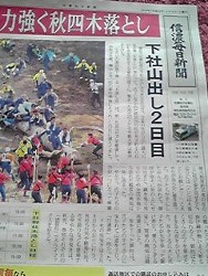2本目を待つ間に1本目の様子を記事にした「信濃毎日新聞」特別号が観客に配られました。観覧席は木落とし坂から遠いので、肉眼では見えるけど、デジカメで撮った写真は豆粒だし、うちらの席からは角度も悪いし、一瞬だからベストショットは難しいんですよねぇ。。