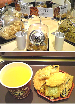 おかき屋さんが経営してるカフェなので、10種類くらいのおかきを小皿一杯分食べていいんデス。。飲み物は、コーヒー、紅茶、オレンジジュース、日本茶が飲み放題。