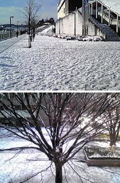敷地が広いから、校舎から学食やコンビニへの移動でかなり歩くことになるんだけど、2階の屋上の広いデッキみたいになってる所を使ったりもするのね。。その屋上を歩いてたら、そこには雪が吹き溜まって10~20センチくらい積もってました