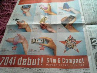 朝、起きて新聞を読んでたら、来た来たー【704i debut!】の広告!
