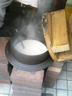 古めかしいお釜の中で暖めた甘酒を、ご主人が、ひとりひとりに柄杓でついで下さるんですよ。